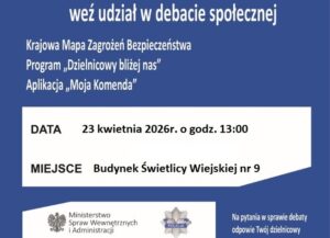 Wójt gminy Gzy oraz Komendant Powiatowy Policji w Pułtusku zapraszają mieszkańców na ewaluacyjną debatę społeczną pod hasłem „Porozmawiamy o bezpieczeństwie – możesz mieć na nie wpływ!”. Spotkanie odbędzie się 23 kwietnia 2026 r. o godz. 13:00. w budynku Świetlicy Wiejskiej nr 9.